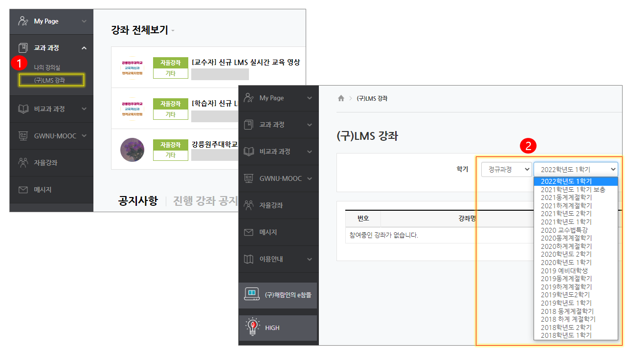 1. 로그인 후, 대시보드 좌측 메뉴 '교과과정-(구)LMS 강좌' 클릭