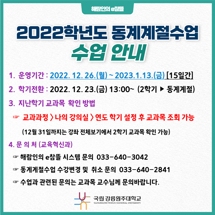 [교육혁신과] 2022학년도 동계계절수업 수업 안내