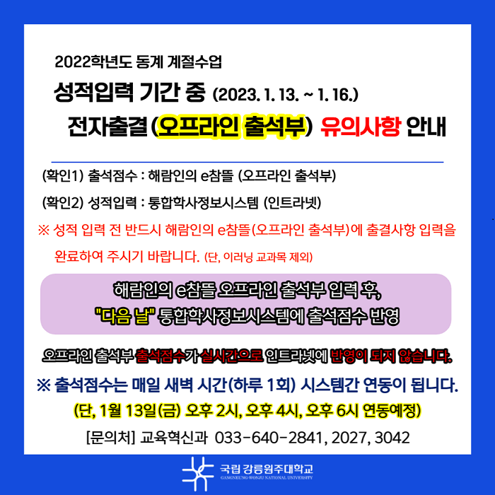[필독] 동계 계절수업 전자출결(오프라인출석부) 유의사항 안내