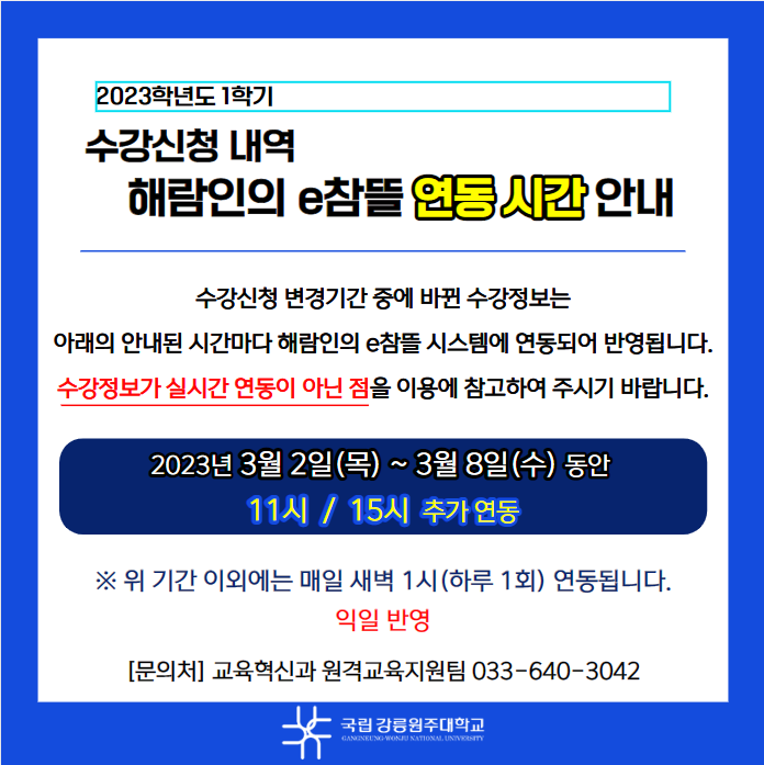 수강신청 변경기간 중 해람인의 e참뜰 연동 시간 안내