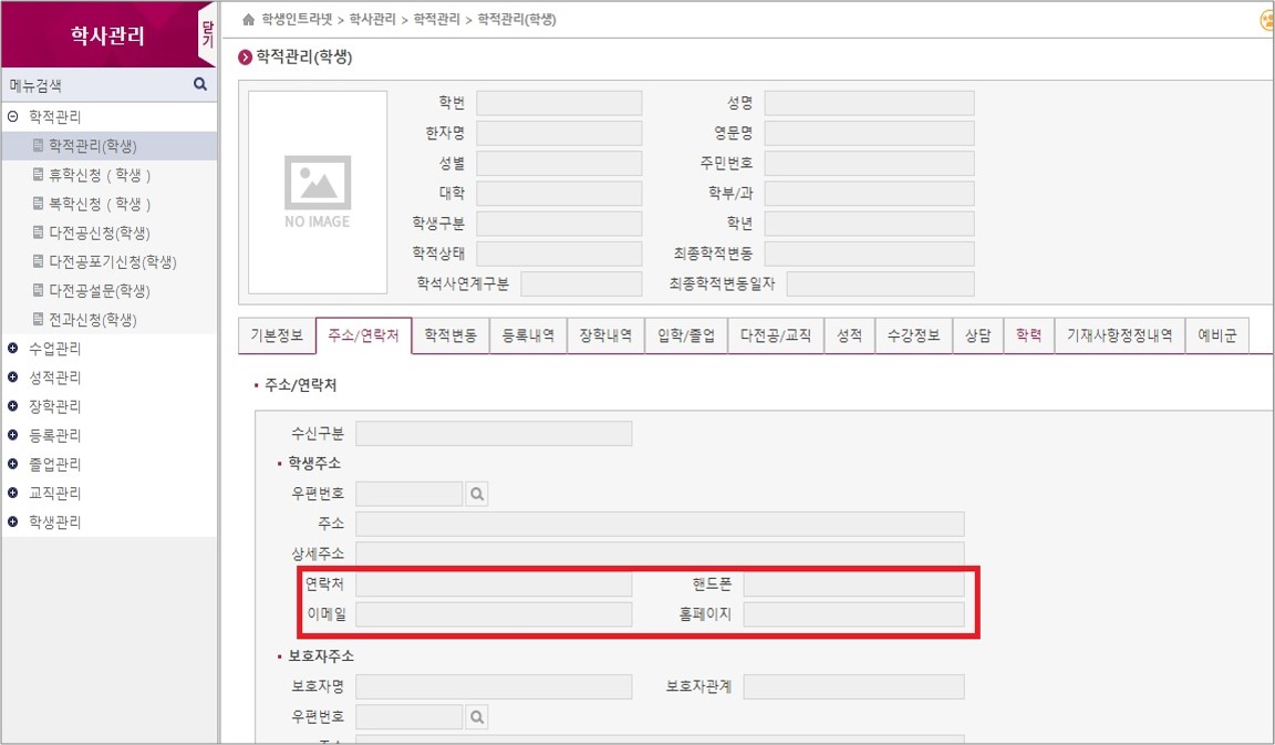 학생 인트라넷 접속 > 학사관리 > 학적관리 > 학적관리(학생) > 주소/연락처