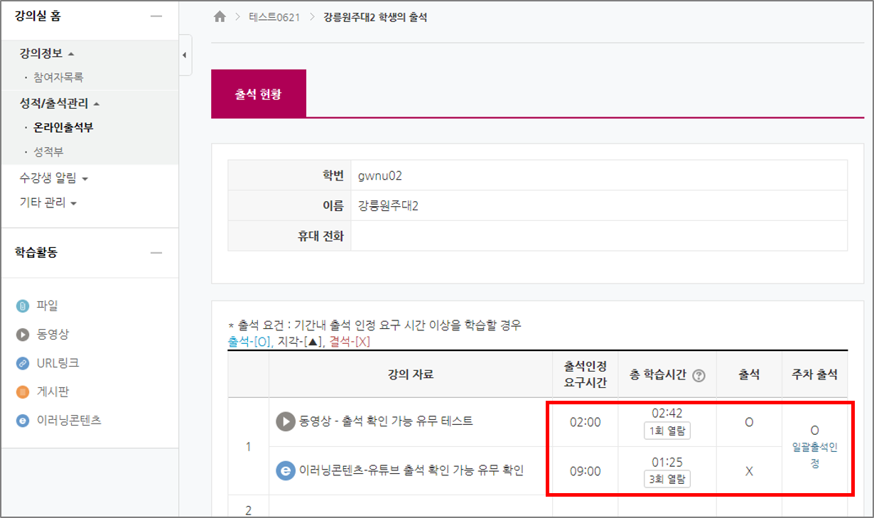 A. 정규 온라인 강좌의 경우 좌측에 "온라인 출석부" 메뉴를 이용하시면 각 주차별 출석여부(학습 완료여부)를 확인하실수 있습니다.