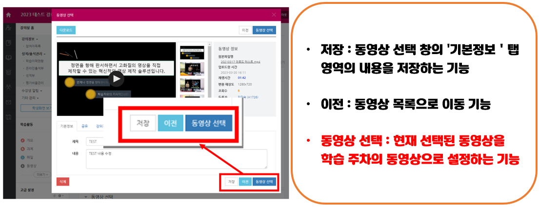 A. 동영상 선택하기 버튼 기능 안내 : '동영상 선택' 버튼을 클릭하여 학습 주차의 동영상으로 설정