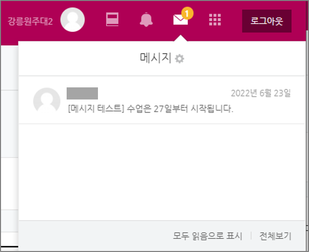 아이콘을 클릭하면 쪽지를 보낸 사람의 이름과 쪽지 내용, 쪽지를 보낸 날짜가 나타납니다.