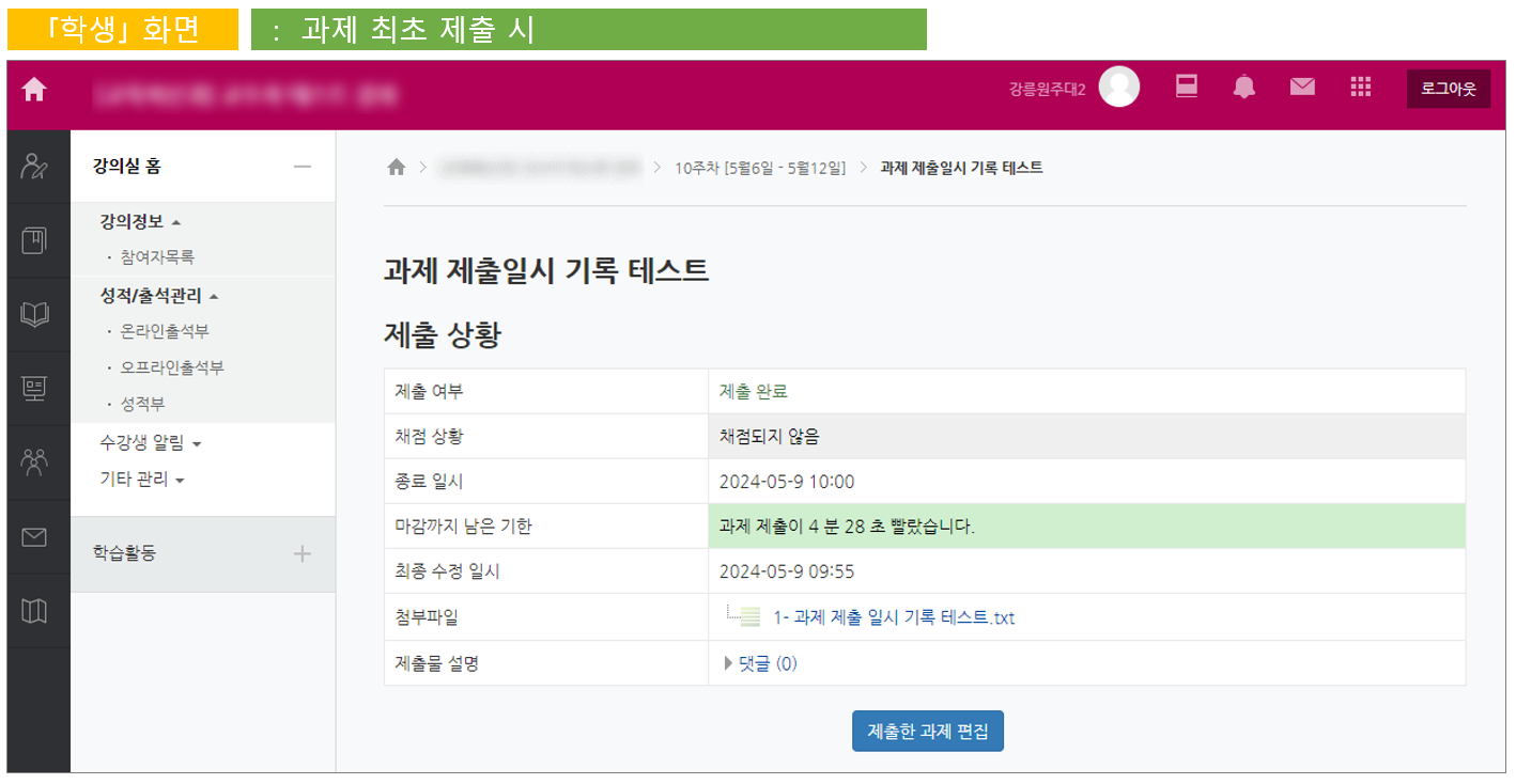 [학습자] 저는 과제를 일찍 냈는데, 왜 늦게 제출한 걸로 나오죠?