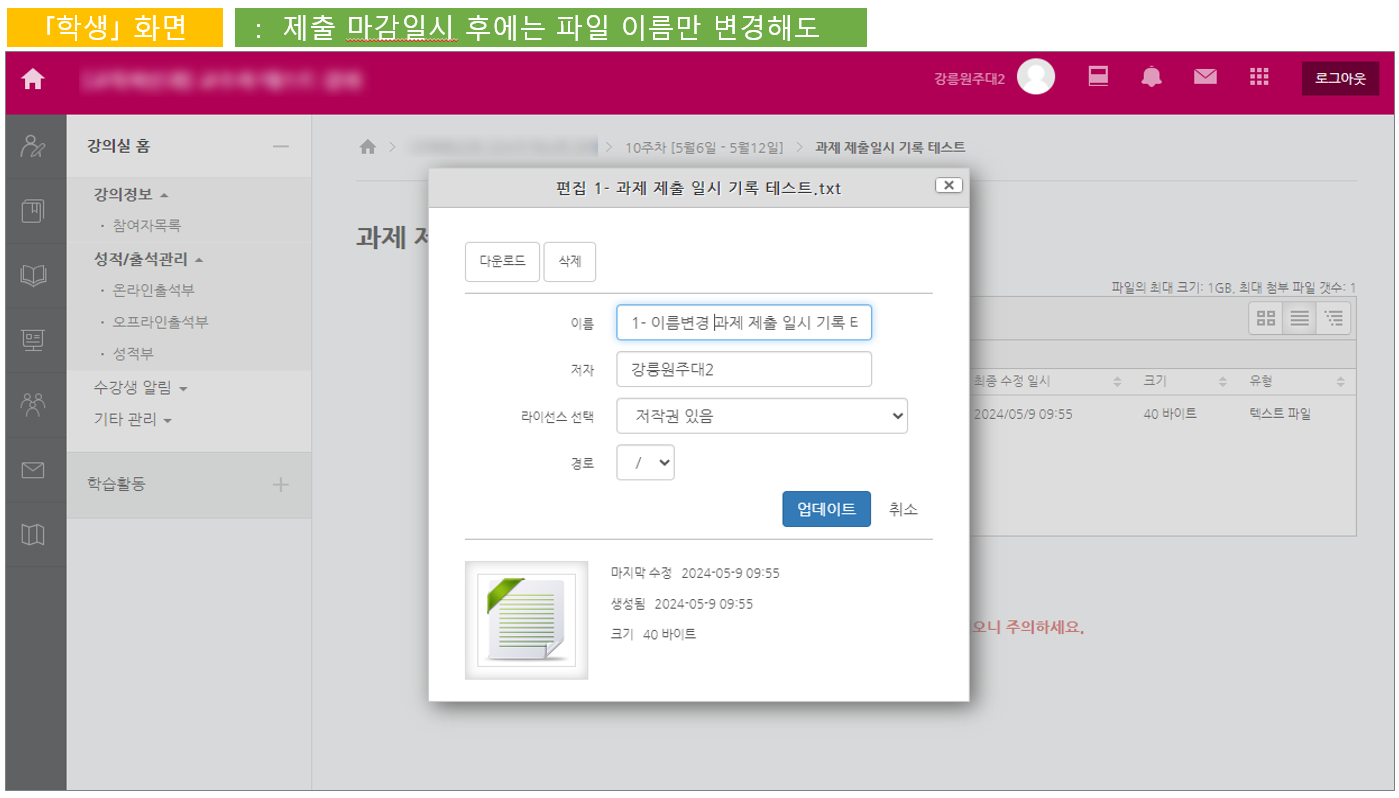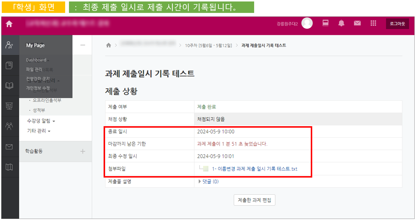 그러나 학습자가 과제물을 등록한 이후, 수정하게 되면 제출일은 최종 수정 일자로 변경됩니다.