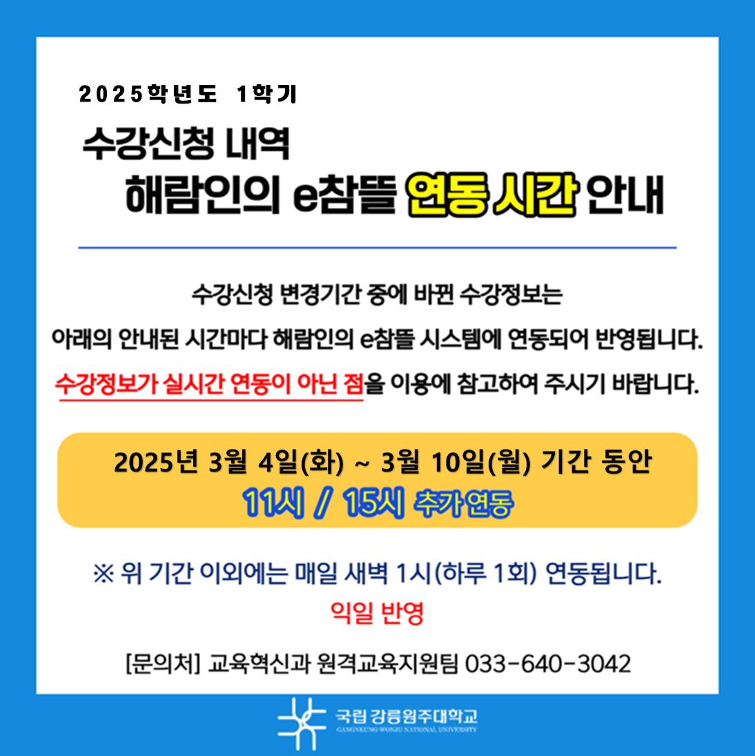 2025-1학기 수강신청 변경기간 중 해람인의 e참뜰 수강정보 연동 시간 안내