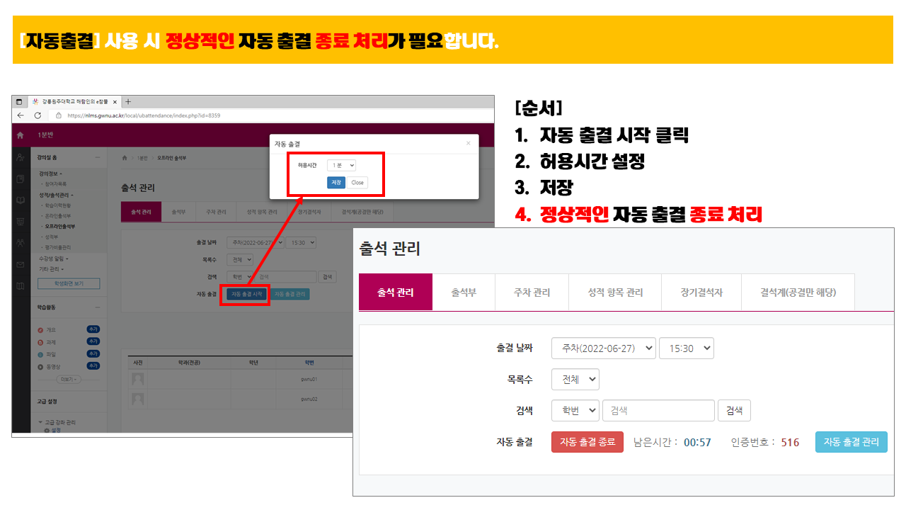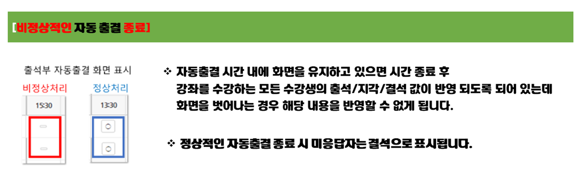 (참고사항 : 정상적인 자동출결 종료 시 미응답자는 결석으로 표시됩니다.)