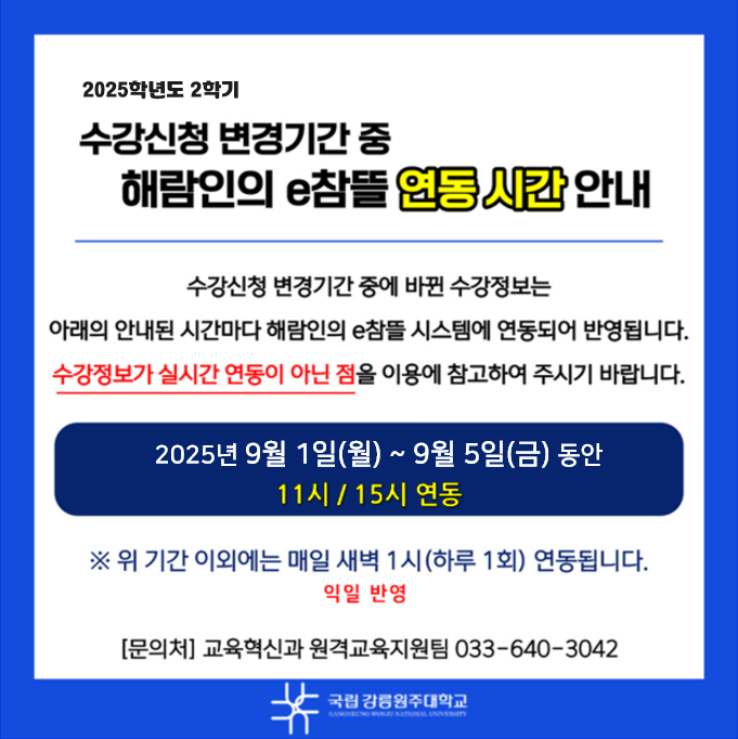2025-2학기 수강신청 변경기간 중 해람인의 e참뜰 수강정보 연동 시간 안내