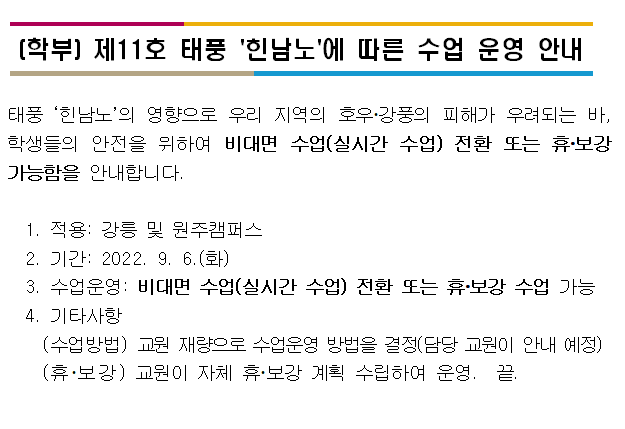[학부] 제11호 태풍 '힌남도'에 따른 수업 운영 안내